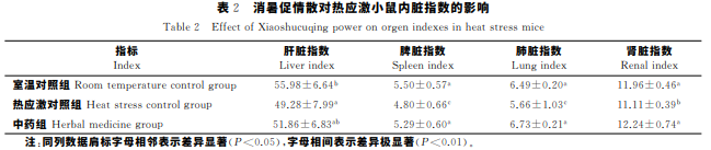 與室溫對照組 相 比,熱應激對照組的小鼠內臟 指數均有所降低,其中脾臟以及肺臟指數極顯著降 低(P<0.01),肝 臟 以 及 腎 臟 指 數 顯 著 降 低 (P < 0.05)。與熱應激對照組相比,中藥組臟器指數均有 所升高(表2)。
