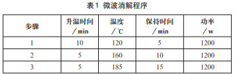 分別精密稱取0.3g北沙參及莖葉樣品,置于聚四氟乙烯消 解罐中,加入 6.0mL HNO3和 2.0mL 30%H2O2,置通風櫥中靜置 過夜。密閉消解罐,按表1微波消解程序進行消解;消解完畢, 待冷卻至室溫后,打開消解罐,將消解后的樣品溶液在電熱板 130℃上加熱趕酸至1~2mL左右,冷卻后用超純水清洗內罐轉 移定容至25ml量瓶中,待測。同時做試劑空白試驗。