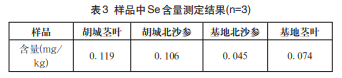按照“1.2.1”項下方法處理樣品,按“1.2.2”項下檢測方法進行測定,每個樣品重復測定 3 次。結果見表3。由表3可知,北沙參莖葉中Se的含量均高于根中的含量 。