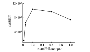 實驗選用 KOH 為催化劑,稱取 50 mg 干酵母 粉,分別加入 0. 01、0. 05、0. 20、0. 60、1. 00 mol /L 的 KOH - CH3OH 溶液 400 μL,超聲反應 30 min,KOH 用量對生物柴油產量的影響如圖 2 所示。