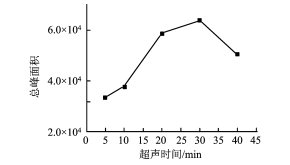 稱取 50 mg 干酵母粉,加入 400 μL 0. 05 mol /L 的 KOH - CH3OH 溶液,考察不同超聲時間( 5、10、 20、30、40 min) 對酯交換反應影響,結果如圖 1 所 示。可以看出,隨著反應時間增加,酯交換效率逐漸 增加,30 min 后得到酯總含量最大,之后酯量有所減 少。這可能是由于時間延長,酯交換反應越來越充 分,但時間過長,超聲使反應體系溫度升高,隨溶劑 揮發造成產物損失。