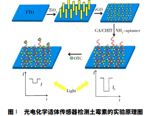 光電化學(xué)適體傳感器檢測土霉素的實(shí)驗(yàn)原理如圖 1 所示。實(shí)驗(yàn)采用 FTO 導(dǎo)電玻璃為基底,在其表 面制備了 TiO2 /石墨烯復(fù)合材料,通過滴涂殼聚糖溶液,使電極表面帶上氨基,通過戊二醛交聯(lián),使氨 基標(biāo)記的土霉素適配體牢固地修飾至電極表面。采用電化學(xué)工作站檢測修飾了土霉素適配體的光電流, 此時(shí)得到的光電流為 I0。將修飾電極用于某一濃度的土霉素溶液測定時(shí),土霉素與其適配體發(fā)生特異 性結(jié)合形成復(fù)合物,測得光電流值為 I。由于目標(biāo)物與適配體的特異性結(jié)合,阻礙了光電傳感界面對光 的有效吸收及光生電子的轉(zhuǎn)移,從而導(dǎo)致光電流減小,其信號值用 ΔI 表示,ΔI = I0 - I。基于電流的變 化值與待測物土霉素的濃度成正比,從而實(shí)現(xiàn)土霉素的測定。