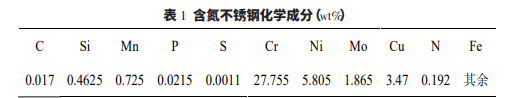 采用 316L 不銹鋼、鉬鐵、Ni 板、金屬 Cr 和氮化鐵 等原材料,在中頻感應爐中熔煉,澆注后試樣的化學成份 如表 1 所示。